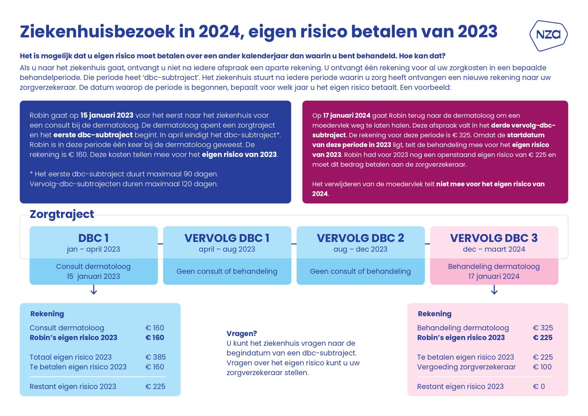 Let op: de startdatum van een zorgtraject (DBC – diagnose-behandelcombinatie) bepaalt over welk kalenderjaar het eigen risico wordt verrekend.